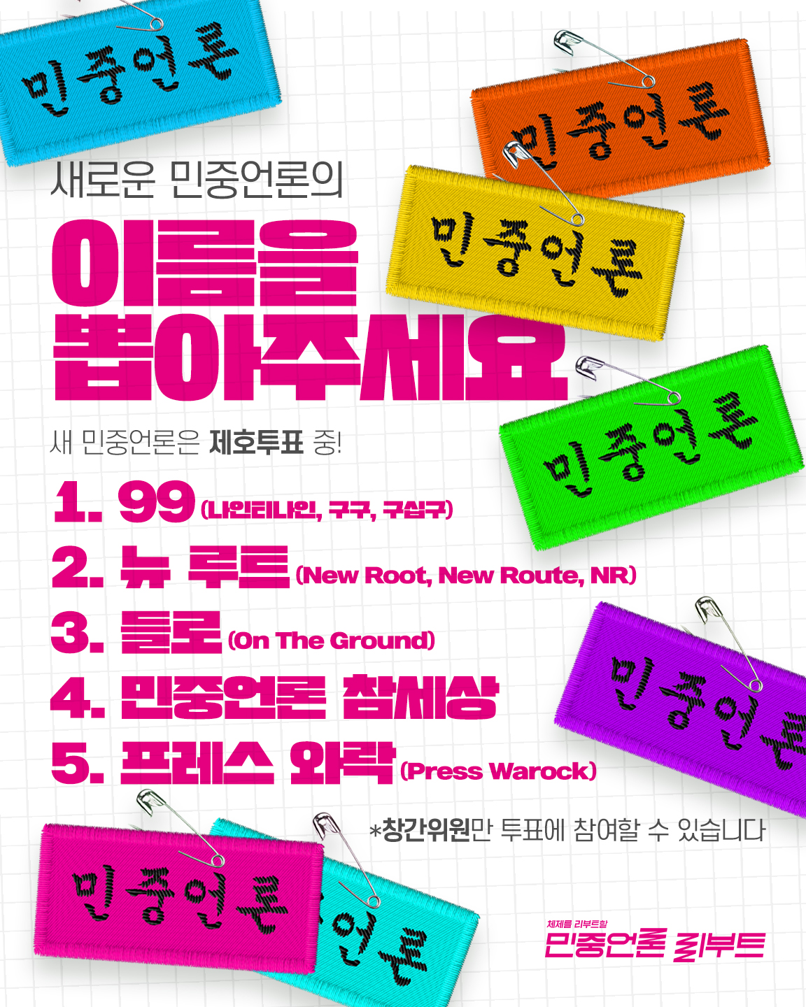 - 제호 투표에는 새 민중언론 창간 위원(리부트 캠페인을 통해 가입하신 창간 위원 + 민중언론 참세상 후원회원)분들만 참여하실 수 있습니다.